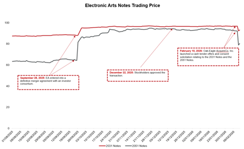 Sounds like a steep discount? Well, note that the 2031 Notes traded in the 80-cents range and the 2051 Notes in the 60-cents range for most of 2025, with their trading prices significantly increasing in late September when an investor consortium, including Silver Lake Management, Affinity Partners and Saudi Arabia’s Public Investment Fund, announced to take EA private. The take-private, once consummated and if triggering a downgrade of the notes from investment grade to junk bond status, would constitute a Change of Control Repurchase Event under the indentures, entitling bondholders to a payment equal to 101% of the aggregate principal amount of the bonds plus any accrued and unpaid interest to the repurchase date (the “CoC Payment”).